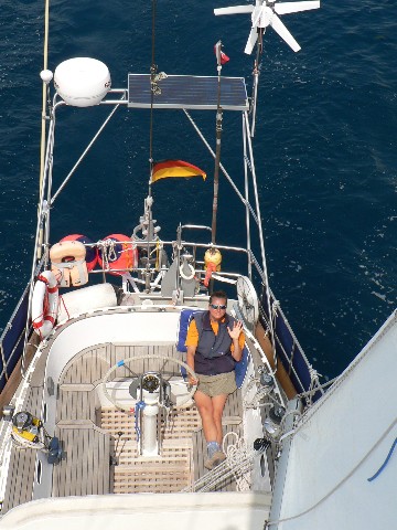 Bislang ist es wirklich toll. Es ist ueberhaupt kein Verleich mit unserer Kaoten-Tour ueber die Biskaya. Der Wind wehte die letzten Tage im Schnitt mit 3-4 Beaufort und heute schlaeft er fast ganz ein. An eine zuegige Ueberfahrt ist dieses Mal nicht zu denken. Traurig sind wir nicht darueber. Unsere Windsteueranlage mag solche leichten Winde gar nicht. Der Winddruck, den die Windfahne der Anlage braucht, um das Boot auf den richtigen Kurs zu halten, ist dann zu gering und das bedeutet fuer uns, dass wir immer wieder den Kurs korrigieren muessen. Wenn der Wind weiterhin mit weniger als 2 Beaufort wehen wird, werden wir moeglicherweise unseren elektrischen Autopilot einschalten. Aber erst einmal abwarten und sich dazu auf das Vorschiff zum Sonnen legen. Schließlich kostet der Autopilot Strom und das einzige was ein Segelboot nicht im ausreichenden Maße zur Verfuegung hat, ist diese kostbare Energie.