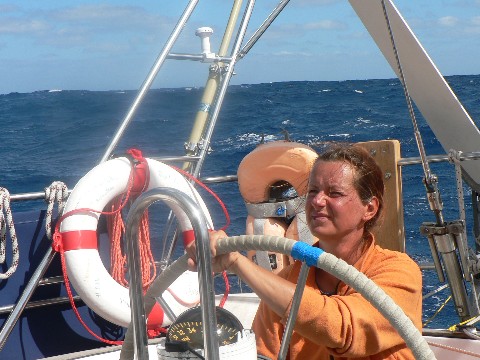 Heute Morgen, ich hatte Wache von 6 bis 9 Uhr, war die See deutlich anders als in den vergangenen Tagen. In der Daemmerung konnte ich es noch nicht richtig erkennen aber deshalb sah es auch fast etwas gruselig aus. Es hatte sich eine hohe Duenung entwickelt. Das ist eine hohe, sehr langgezogene Welle, die verursacht werden kann, wenn irgendwo in einem weit entfernten Seegebiet sehr viel Wind war oder sich gerade ein neues, sehr starkes Windgebiet in unsere Richtung bewegt. Die Wettervorhersage fuer die kommenden Tage, die wir jeden zweiten Tag ueber unsere Kurzwellenanlage abrufen, verriet uns, dass in ein bis zwei Tagen der Wind staerker werde wuerde. In unserem Seegebiet soll es dann mit ca 6 Beaufort wehen. Wir sind gespannt, noch duempeln wir vor uns hin.