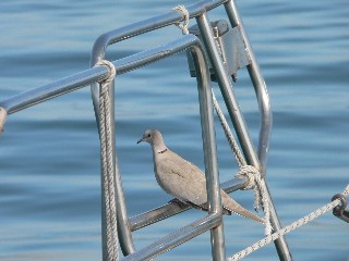 Rechts: Diese Taube ist die gesammte Reise von Peniche bis Lissabon, ca 60 Seemeilen, mit uns gesegelt. Erschöpft landete sie im dichten Nebel auf unserem Deck und suchte Windschatten. Als es mit 7-8 Windstärken wehte, kauerte sie dicht vor unserem Mast. Als wir unter Sonnenschein in Lissabon einliefen, flog sie auf den nächst stehenden Baum