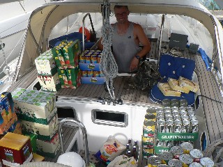 Wir brauchte zwei Tage um unseren Großeinkauf in unserem sowieso schon voll bepackten Boot zu verstauen. Dabei blieb das naechste Malheur nicht auf sich warten. Bei dem Verstauen der Saefte touchierte ich das Schauglas unseres Petroleumtankes und der bedankte sich damit, dass er zu lecken anfing. Nun war guter Rat teuer. Der Tank ist komplett in einem schwer zugaenglichen Schrank eingebaut. Uns blieb erst einmal nichts anderes uebrig, als den Druck aus dem Tank zu nehmen, damit nicht weiter Petroleum aus dem Tank leckte.