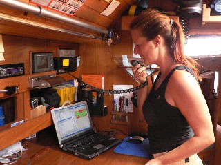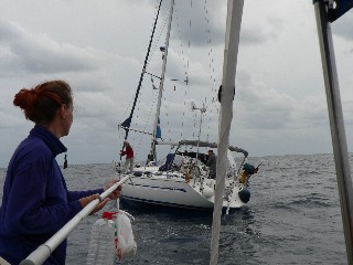 Ansonsten stehen wir über Kurzwelle - um 16.00 Uhr UTC auf 7050 kHz - mit drei weiteren Segelbooten in Kontakt, die sich im 200 Seemeilenradius von uns befinden, der Adjerynja (www.blauwassersegeln.com) und zwei hollaendischen Booten. Ein kleines Stahlschiff mit Jost und Ilse und eine 14- Meter Aluyacht mit Martin und Dirma, die noch ihr 8-Monate altes Kind dabei haben.