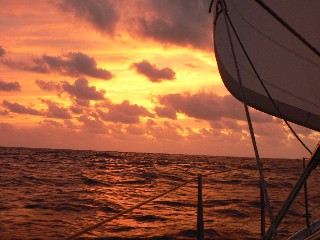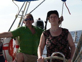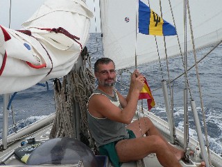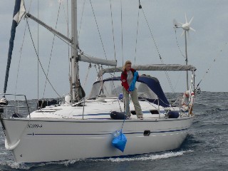 Danach kochen wir regelmaessig und gegen 21.00 Uhr legt sich Martina in die Koje, gegen 01.00 Uhr loest sie mich bei der Wache ab. Von 05.00 bis 08.00 Uhr schlaeft Martina und ich gehe dann, wenn es langsam hell wird, nochmals fuer 2 Stunden in die Koje. Die Wache hat jeweils nicht viel zu tun. Denn bisher brauchten wir die Segel nicht zu veraendern und die Aries, unsere Windsteueranlage, pfluegt das Boot selbststaendig durch die Wellen. Dennoch muss man staendig auf moeglichen Schiffsverkehr und insbesondere Wetterveraenderungen, die sehr schnell kommen koennen, gefasst sein. Die Aldjeryna und die Rose hatten wohl bereits Kollisionskurs mit einem Tanker, auch wenn wir seit Tagen kein Boot oder Schiff mehr gesehen haben.
