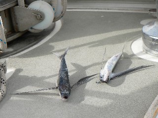 Heute morgen lagen erstmals sogenannte fliegende Fische an Deck, gleich 5 Stück. Sie sehen fast aus wie Heringe, haben auch in etwa die gleiche Groesse, nur dass sie noch auf jeder Seite einen Fluegel haben. Ab und zu sieht man welche dicht ueber der Wasseroberflaeche fliegen, bisher immer gegen den Wind, so um die 30 bis 50 Meter weit und meist in Gruppen.
