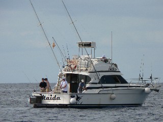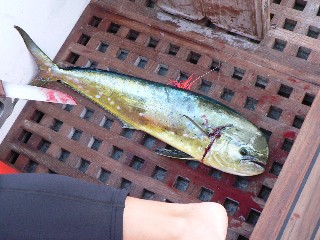 Heute hat Martina nochmals den gleichen Fisch gefangen wie vorgestern, eine Goldmakrele, auch Mah-Mahi genannt. Ein wunderschoener Fisch, kräftig gelb und blau gepunktet mit einer ausgeprägten Schwanzflosse. Und er fasst sich alles andere als ein Hering an, nämlich unheimlich fest. So schmeckt er denn auch. Wir waren mindestens so begeistert von dem Geschmack wie von einem Thunfisch