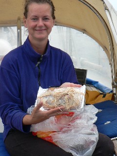 Nochmals zurueck zu der SY Rose, die uns inzwischen weit voraus ist. Olga hatte ja an Weihnachten zwei Kuchen gebacken und sie kam mit Peter am Nachmittag des 1. Weihnachtstages tatsaechlich an uns heran. Sie hatte den einen Kuchen bereits in viel Folie gewickelt und ihn so in einen blauen Muellsack gelegt und an diesen zunaechst eine leere 5-Liter Wasserflasche gebunden und daran ein langes Seil. Das liessen sie hinter sich ins Wasser und fuhren unter Motor – die Segel hatte sie dafuer eingeholt – schraeg vor uns und wir konnten mit unserem Bootshaken das Seil erfassen und dann den Muellsack zu uns an Bord holen.