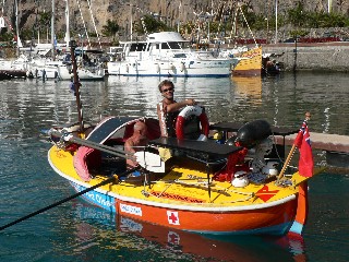 Im Hafen liegen vier bunte Ruderboote, die von hier auch über den Atlantik nach Antigua wollen. Drei Einmannboote und ein Zweimannboot. Das beruhigt uns doch etwas für unsere Ueberfahrt, auch wenn wir das mehr verrückt finden. Das ganze ist organisiert von irgend einem windigen Veranstalter. Direktor ist Kenneth. Ihn und zwei Ruderer lernen wir kennen. Graham aus England und Victor aus Kirgisien. Sie haben Probleme mit den Hafenbehörden und der Guardia Civil, die sie – aus welchen Gruenden auch immer – nicht aus dem Hafen lassen wollen. Alle koennen kein spanisch und Victor kann nur russisch, so dass Olga von der SY Rose, die russisch und spanisch spricht und auch ihr Freund Peter, der fliesend spanisch spricht, fuer sie mit den Behoerden dolmetschen. So lernen wir die drei kennen und gehen abends mit ihnen in das gleiche kleine Restaurant essen.
