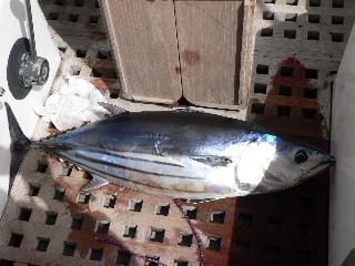 Gestern haben wir unseren ersten Thunfisch gefangen! Unser Pulpo-Koeder mit Doppelhaken und Stahlvorfach hing an der starken Nylonschnur nur circa 10 bis 15 Meter hinter dem Boot. Die Rolle mit der Schnur war in der Plicht festgebunden und mit zwei Waescheklammern fixiert. Als diese wegsprangen, stuerzte Stefan zur Rolle, band diese los und meinte gleich, da sie mal wieder ein grosser Fisch an der Angel. Waehrend die Goldmakrelen immer an der Wasseroberflaeche schwammen und auch mal aus dem Wasser sprangen, ging die Leine dieses Mal nach unten. Deshalb dachten wir gleich, das muss ein anderer Fisch sein. Erst als das Ende der Leine unmittelbar hinter dem Boot war, sahen wir den silbrigen Thunfisch. Ich hatte schon den Koecher in der Hand und so bekamen wir den Thun in die Plicht. Ein praller Streifenthun, 78 cm lang und circa 7-8 kg schwer. Kaum lag der Junge in der Plicht, ging der Angelhaken von alleine raus.