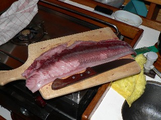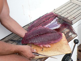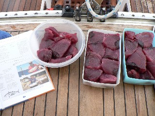Welch eine Ueberraschung, zumal es uns auch gelungen ist, ihn gleich an Bord zu bringen (das ist bei uns nicht ganz so einfach, da wir keine Badeplattform wir viele moderne Boote haben). Gut, dass Stefan in Puerto Mogan bei Ivan, dem ehemaligen Fischer und Hochseesportangler von der MAIDA, einen kleinen Lehrgang zum Ausnehmen von Thunfischen gemacht hatte. So lag unser Streifenthun eine knappe Stunde spaeter filettiert in Tuppawaredosen. Abends schmeckte der erste selbstgefangene Thunfisch denn auch ganz besonders.