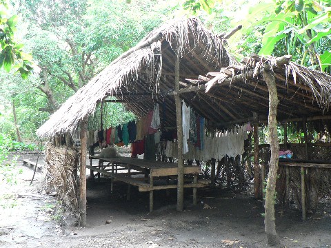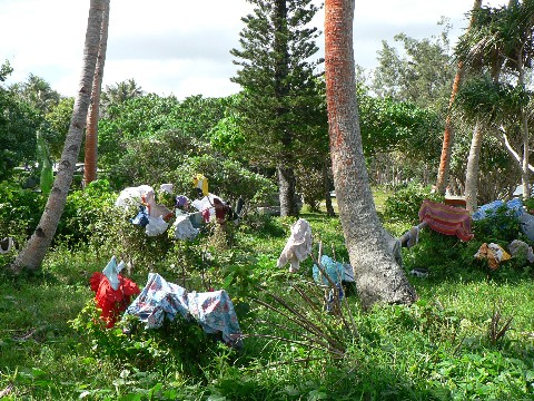 Hier war Waschtag. Die nassen Sachen werden einfach zum Trocknen auf Büsche oder andere Pflanzen gelegt. Das hatten wir schon in Französisch Polynesien gesehen.