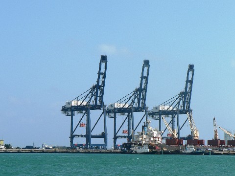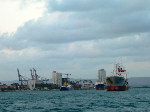 Unsere ersten Bilder von dem Vorhafen zu den großen Schleusen des Panama Kanals. Mann kann sich dass so vorstellen, dass weit vor dem Schleusenbereich, cirka 5 Seemeilen entfernt, ein riesiger Vorhafen ist, in dem Schiffe be-und entladen werden und auch zum Teil auch nur vor Ankerliegen. Vor diesem riesigen Vorhafen ist aber die eigentliche Reede und dort lagen bestimmt an die 50 Frachter.
