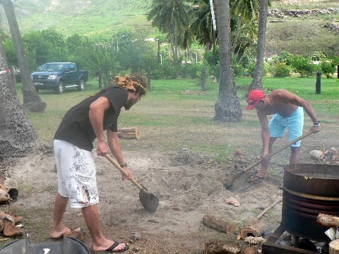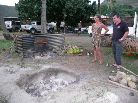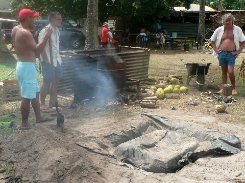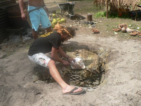 In der Bildmitte ist der Erdofen zu erkennen. Auf die Holzkohleglut wurden Korallensteinen gelegt, die sich dann mit der Zeit erhitzen. Unterdessen bereiten die Einheimischen die Füllung für den Ofen vor.