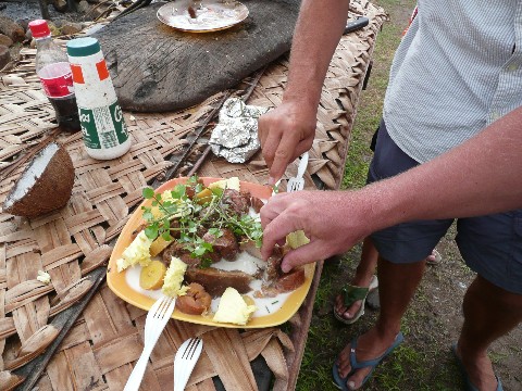 Am unteren Tellerrand seht ihr eine gelbe und eine braune Kochbanane. Die gelbe wurde tatsächlich gekocht und die braune kam aus dem Erdofen. Neben der braunen Banane liegt ein helles Stück Brotfrucht und da drüber ein braunes Stück Brotfrucht. Das braune kam aus dem Ofen und schmeckte weich und ähnlich wie süßliches Kartoffelmus. Die helle Brotfrucht wurde einfach sehr lange auf heiße Holzkohle gelegt und schmeckte fast wie eine sehr gute festkochende Kartoffel. Das Schweinefleisch war Butter zart und zerfiel in unseren Fingern. Und die grüne Garnitur war ein Mix aus Ruccula und Bärlauch. Die Krönung war allerdings die selbstgepresste Kokosmilch, die über das Ganze gegossen wurde.