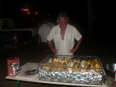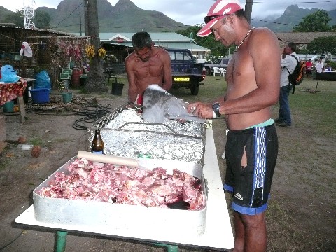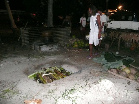 Zwei Männer, der rechte davon heißt Fregeant, den wir später durch Stefan kennenlernen sollten, bereiteten die Füllung für den Erdofen vor. Schweinefleisch und Brotfrüchte wickelten sie in Alufolie ein. Früher verwendete man dafür Bananenblätter. Dann wurde alles in einen Eisenkorb gelegt und zum Schluß kamen oben drauf noch Kochbananen.