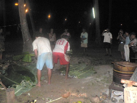 Die Männer schichteten jetzt mindestens 100erte Bananenblätter über den Korb, decken das ganze mit einer Folie ab und verschlossen die Grube mit viel Sand. Fertig. Jetzt mußten wir alle bis zum nächsten Vormittag warten, erst dann wurde der Erdofen wieder geöffnet.