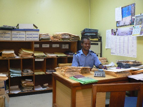 Der erste Gang bei der Einreise in ein neues Land ist wie immer der zu den ensprechenden Behörden. Rechts im Bild, dieser freundliche Beamte begrüßte uns von der Zollbehörde. Auch hier ging alles seinen geordneten Gang. Papiere ausfüllen, stempeln, wegheften und bezahlen. Gleichzeitig informierte er uns auch noch über die kommenden Festivitäten anläßlich der 30 jährigen Unabhängigkeit der Salomonen. Eine Tür weiter war die Landwirtschaftsbehörde und zur Immgration mußten wir ein paar Häuser weiter. Alles im allem kostete uns das Einklarieren knappe 30 Euro, dafür behielten sie unseren gesammten Müll der letzten drei Wochen, den wir hatten mitbringen müssen und wir bekamen eine Aufenthaltsgenehmigung für drei Monate.