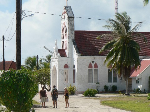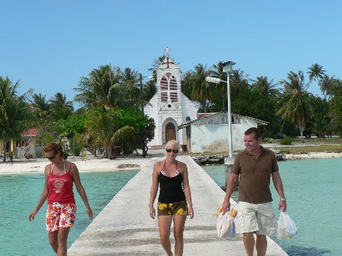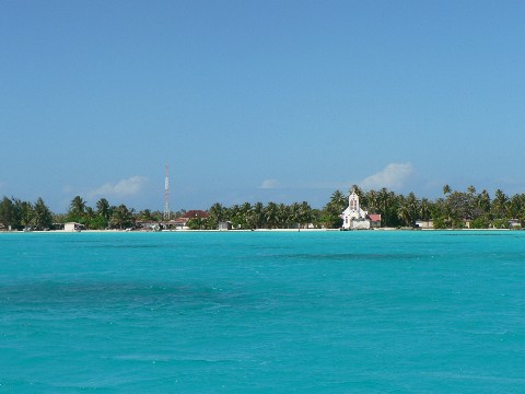 Der Blick von unserem Ankerplatz in der Lagune. Das Dorf von Kauehi liegt vor uns. Wir liegen hier circa eine Seemeile vor dem einzigen kleinen Ort des Atolls mit dem Namen Tearavero mit seiner hübschen kleinen Kirche unter Palmen, die zu den Messezeiten regelmäßig läutet. Wenn man sich einmal vorstellt, daß wir uns hier inmitten des riesigen Pazifiks befinden, auf einem winzigen Atoll, daß Ihr wahrscheinlich in den Atlanten gar nicht namentlich finden werdet und dann die vertrauten Klänge von einer Kirchenglocke hört, dann glaubt man fest daran, daß die Welt hier noch in Ordnung sei.