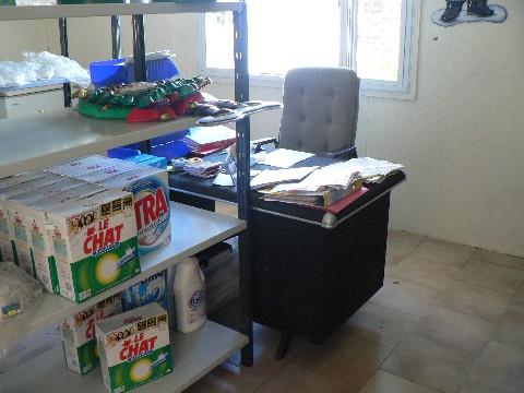 Das Büro des Ladens. Es befindet sich an der Stirnseite eines Regals für Reinigungsmittel.