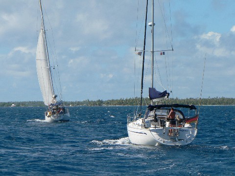 Die Riffpassage liegt erfolgreich hinter uns. Vor uns fährt die YAGOONA und unter Segel die DINGO. Das Problem mit den Riffpassage in die Atolle ist dieses, dass wenn man zur falschen Zeit der Tide durch die Passage fahren will, enormer Strom setzen kann, dieser das Boot in seiner Manövrierfähigkeit stark beeinträchtigt, bishin zum lahm legen, dazu unkontrollierte Stromschnellen entstehen und am Ende das Boot in ernste Schwierigkeiten geraten kann. Leider sind das keine Seltenheiten, denn viele Wracks zieren die Riffe zahlreicher Atolle.