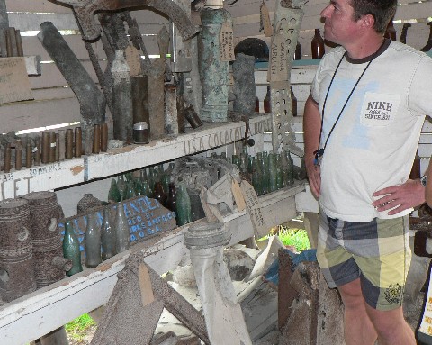 Stolz erzählte uns dieser betagte Herr von seinen Sammlerstücken aus dem zweiten Weltkrieg. Von Deutschland würde er viel halten, der Fußball wäre Klasse und Hitler war ein tapferer Mann gewesen. Da mußten wir dann doch alle etwas schlucken. Aber nach kurzer Zeit ging es dann doch um die aktuelle Politik in Vanuatu. Er erzählte uns, das mit Hilfe der Amerikaner bald eine neue, gepflasterte Strasse um die komplette Insel entstehen soll. Darauf würde er sich schon freuen, denn dann würden vielleicht mehr Besucher in sein Museum kommen. Wir fragten ihn, ob nicht Strom-und Wasserleitungen für das Dorf oder mehr Geld für die Bereitstellung von Schulgeldern für arme Familien sinnvoller wäre. Da wurde er etwas unsicher, meinte aber die Strasse wäre aber auch gut.