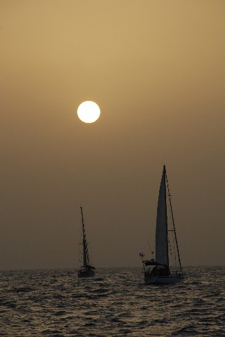 | Der feine Wüstensand setzte sich überall fest. So wie oben im Bild sieht MULINE überall aus; an den Wanten, den Tauen, das Sonnensegel, die Persenning und die Segel. Natürlich war auch im Boot alles mit einer hellbraunen Sandschicht überzogen. Selbst zwischen den Zähnen knirschte es. | |||||||||||||||||||