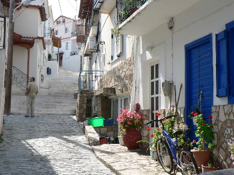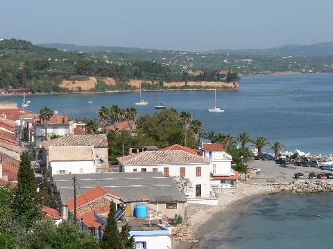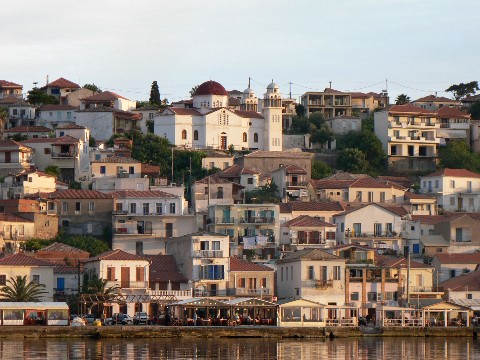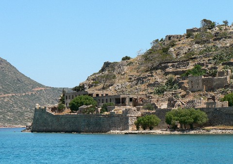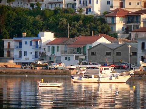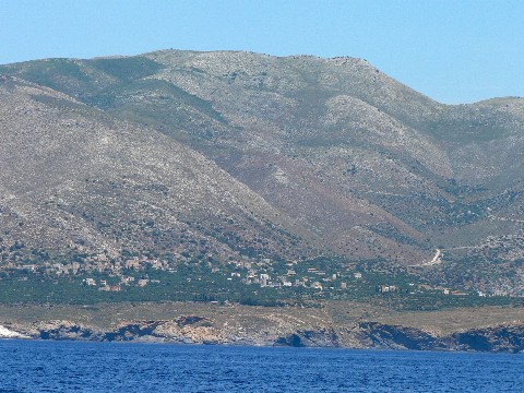 Am nächsten Morgen erwartete uns dann diese Kulissen. Vor uns lagen hohe Berge, die mit niederen Gesträuch bedeckt waren und von denen ein würziger Geruch zu uns herüber strömte. Ein netter Willkommensgruß der Griechen wie wir fanden. Am Fuße der Bergkette lag ein kleinerer Ort der deutlich Zeichen von Tourismus erkennen ließ. Hinter uns, auf einer kleinen Insel, lag ein altes Fort, das früher einmal Leprakranken als Unterkunft diente. Schon früh am Morgen brachten kleine Ausflugsboote viele Touristen auf die kleine Insel.