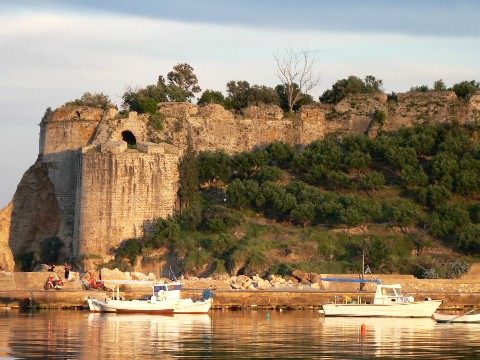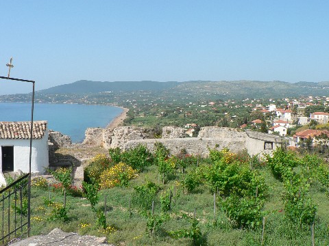 Im Hintergrund, ein weinig im Schatten, ist ein altes Kastell zu sehen. Es steht auf einer kleinen Halbinsel und diente uns als gut Landmarke bei der Ansteuerung von Koroni. Von dem einstmal mächtigen Kastell ist außer den Mauern und einem venezianischen Torbogen nicht mehr allzuviel übrig geblieben. Aber im Festungsgelände befindet sich jetzt ein Kloster, dass sehr sehenswert ist.