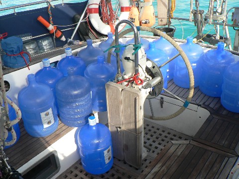 Das Gleiche galt für das Trinkwasser. Es gab zwar ei n kleines Versorgungsschiff, welches Trinkwasser bequem an Bord liefert aber die Qualität des Wassers sollte von diesem Schiff nicht so besonders sein und andere Segler empfahlen uns, Trinkwasser in den normalen 5 Gallonen Flaschen von Land zu ordern. Das taten wir auch und füllten dann alle 16 Bottels in unseren Trinkwassertank um.