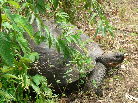 Im Reservat angekommen, schlugen wir uns in die Büsche. Und es wurde gar nicht so einfach, die restlichen 2998 Schildkröten zu entdecken. Wir kamen uns vor, wie zum Eiersuchen zu Ostern oder im Herbst beim Pilze sammeln. Einen ausgeschilderten Weg oder verschiedene empfohlene Rundtouren gibt es nicht. Wir konnten aber die gut ausgetretenden Trampelpfade aller derer erkennen, die auch schon auf der Suche nach den Riesenschildkröten hier unterwegs waren. Wir trafen zwar ab und zu kleinere Besucher-Gruppen im Unterholz, die sich einen professionellen Fremdenführer gebucht hatten, aber auch deren Ausbeute, die unzähligen Schildkröten zu Gesicht zu bekommen waren mager. Aber dann war es wieder so weit. Nummer Drei lugte aus dem Dickicht!