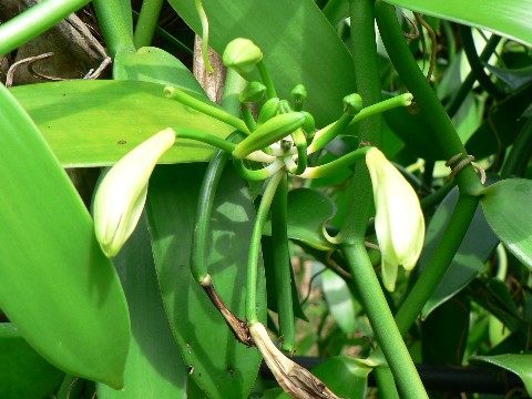 Nach der künstlichen Befruchtung durch die Plantagenarbeiter, reifen die Blüten zu solchen Bohnen. Wenn diese Schote langsam von unterher gelb wird, ist Erntezeit. Sie werden gepflückt, für nur 3 Minuten ins kochende Wasser gesteckt, dann für zwei oder drei Tage in 37 Grad warme Behältnisse gelegt und dann in die Sonne zum Trocknen. Und dann riechen und sehen die Vanilleschoten so aus, wie wir sie aus unseren Supermärkten kennen, schwarz und unheimlich gut riechend.