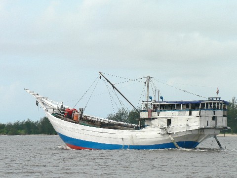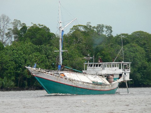 Ein Pinisi kommt uns auf dem Kumai River entgegen.