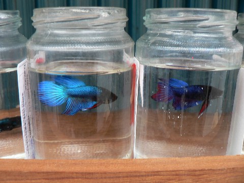 Diese wunderschönen Exemplare kosten jeweils nur knapp einen Euro. Damit die Fische nicht ständig in Angriffsstellung gegen ihre Glasnachbarn gehen, wurden zwischen den Gläsern Papierkarten aufgestellt