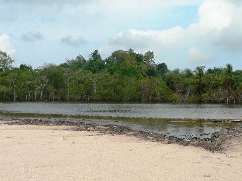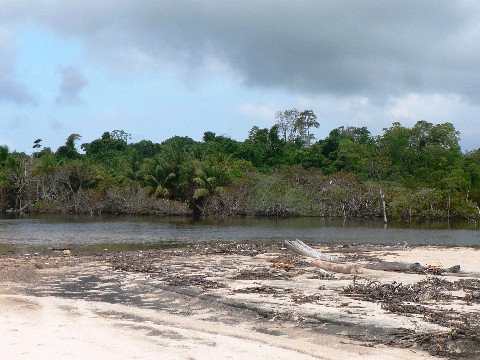 Ein etwas kleines Exemplar von einem Leguan. Das waren aber nicht die einzigen Reptilien am Strand. Die anderen waren nicht zu sehen und das war auch gut so. Denn, auf unserem Rückweg zu unserem Dingi sahen wir eine riesige Spur eines Krokodils im Sand, die geradewegs von Dschungel ins Wasser führte. Vor bei an unserem Dingi......Wir waren schwer beeindruckt und schluckten erst einmal kräftig.