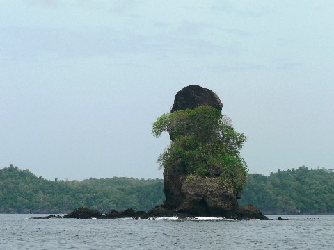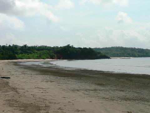 Hier gibt es zwei große Sandstrände mit Urwald gleich dahinter und ansonsten hohen schwarzen Felsen. Die Sandstrände haben wir bereits erkundet, der Urwald ist zu dicht, um hineinzugehen.