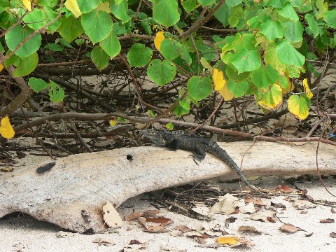 Am Strand gab es unzählige Einsiedlerkrebse, die ihr kleines Muschelhäuschen auf dem Rücken tragen, Krabben in unterschiedlichen Größen und Leguane. Als ich den ersten in etwa zwei Meter Entfernung sah, spurtete ich in die eine und er im gleichen Augenblick in die anderer Richtung. Er hatte immerhin eine Länge von knapp einem Meter. Das passierte mir aber nur einmal. Denn dann holte ich die Kamera. In dem Gebüsch zwischen dem Strand und dem Urwald gab es viele von diesen Tieren.