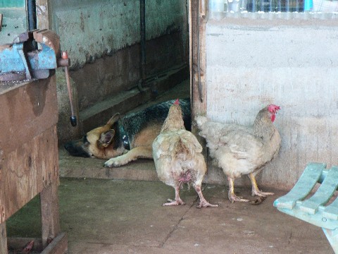 Bella, die Schäferhündin und ihre "Kampfhühner". Solch prächtigen Exemplare von hühnern haben wir noch nie gesehen. Achtet mal auf das Größenverhältnis zu Bella. Die Hühner waren riesig. Und meisten hatten Martina die kräftigen und strammen Hühnerfüße gefallen. Ganz zu schweigen von dem Dornfortsatz des Hahnes. Wir können nur sagen: " Es waren ausgesprochene Dschungelhühner! Die können es notfalls auch mit einem Krokodil aufnehmen" .