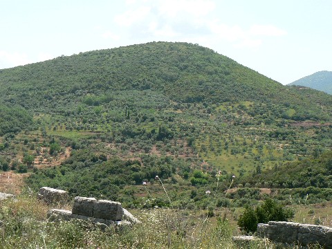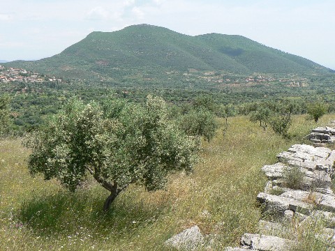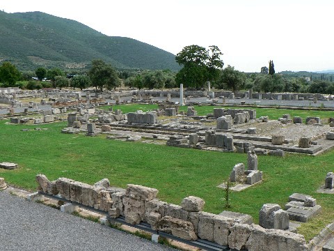 Hier sieht man das alte Messene im Vordergrund und neue Messene im Hintergrund. Das alte Messene stellt einen Straßenzug dar.