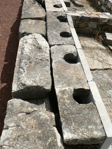 Schon zu der damaligen Zeit gab es " Das Stille Örtchen". Hier ist die antike Version zu sehen. Eine Art Plumsklo aus Stein. Unter den Falllöchern befand sich ein Wasserkanal, der mit Wasser aus dem nahe befindlichen Fluss gespeist wurde. Ich gehe mal davon aus, dass zwischen den einzelnen Sitzmöglichkeiten Trennwände bzw., Sichtschutze bestanden hatten. Ansonsten verdiente