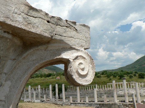 Das ist eine Säule, auf der zu früherer Zeit eine Bronze Statur eines bedeutenden Bürgers der Stadt gestanden hat. Wer diese Person war haben die Forscher nicht herausfinden können. Die Säule ist 4,85m hoch und setzt sich aus 7 Trommeln zusammen. Gefertigt wurden die Säulenteile aus einer Art Kalkstein.
