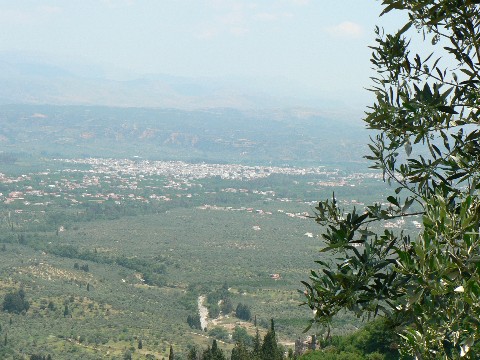 Ein Blick auf das neue Messene. Diese gleichnamige moderne Stadt liegt oberhalb der Ausgrabungsstätten am Hang und man hat von dort aus einen wunderbaren Blick über das alte Messene. In dem neuen Messene leben etwa 10 Tausend Einwohner.