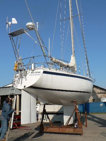 Zusammen mit zwei weiteren baugleichen Schiffen wurde unsere SY MULINE auf der Werft Sandmeier gebaut. Alle drei Schiffe wurden für ausgedehnte Langfahrten konzipiert und ausgebaut. Dabei wurden auf den Innenausbau und die Ausrüstung großes Augenmerk gelegt. Eine solide Isolierung mit 5cm Spezial- Polyurethan-Schaum, großdimensionierten Lewmar Winschen (48ST), stabile und dichte GOIOT Luken sowie ein starkes Rigg sind nur einige Indizien dafür. So segelte ein Vorbesitzer mit diesem Schiff bereits von 1986-1989 erfolgreich um die Welt. Für unsere jetzige Tour haben wir die Ausrüstung von MULINE noch etwas erweitert. Diverse elektronische Geräte und einen Geräteträger für die Installation des Windgenerators und unsere Radar- und Solaranlage sind neu hinzugekommen.
