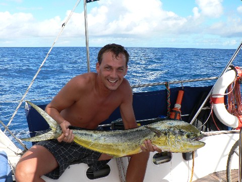 Kaum hatten wir Nuku´alofa verlassen, wurde die Angel ausgeworfen. 24 Stunden später, pünktlich zum Abendessen, zog es an der Leine. Ein zirka 5 Kilo schwerer und 110 cm langer Mahi Mahi hing an unserer Angel. Eine Stunde später lag er friedlich in heißer Butter in unserer Pfanne.