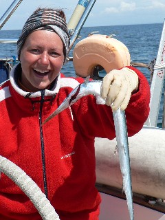 Heute habe ich zwei Hornfische! gefangen und es war wunderschönes Segelwetter. Wir segelten von Wismar in Richtung Grömitz. Über Wismar hielt sich noch hartnäckig ein Schlechtwettergebiet mit vielen Böen und Regenschauern. Aber bei Verlassen der Wismarer Bucht hellte es auf und wir segelten gemächlich mit 2 bis 4 Knoten nach Grömitz. Und dann war Angelzeit angesagt. Ich holte mein in Griechenland gekauftes Angelrad herraus und schleppte es einfach nach. Und kaum war eine halbe Stunde vergangen, da zuppelte es an meinem verrosteten Harken. Der erste Hornfisch. Unser Jubel war groß. Hatte ich doch seit Jahren nichts mehr gefangen. Schnell war der Fisch erledigt und wieder raus mit der Angel. Und siehe da, nach 20 Minuten der nächste Hornfisch am Harken. Beides waren gute Portionsfische, so das unser Abendbrot, Hornfisch gebraten in Butter und Bratkartoffeln, gesichert war.
