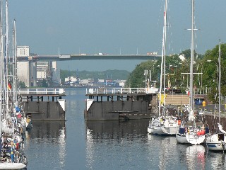 Gegen 7.30 Uhr legten wir in Richtung Schleuse ab. Aber das Wetter machte uns einen Strich durch die Rechnung. Über den Kanalfunk erfuhren wir, daß Nebel im NOK sei und vorrausichtlich erst gegen 9 Uhr die Sportboote wieder geschleust werden. Also wieder zurück und warten. Gegen 9 Uhr ging es tatsächlich weiter. Wir wurden zusammen mit 8 weiteren Yachten geschleust. Der Schleusvorgang dauerte nicht lange, da das Gefälle nicht groß war. Stefan war noch nicht vom Bezahlen der Kanalgebühr zurück, da öffneten sich bereits die beiden Schleusentore.