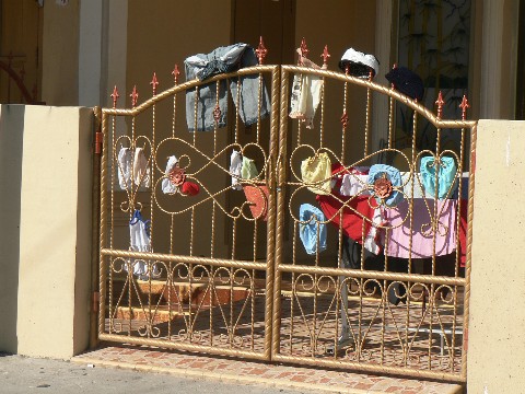 Hier war gerade Waschtag. Manchmal wird die Wäsche einfach auf Sträucher oder Rasen gelegt oder ganz normal auf eine Leine gehängt, aber das ist eher selten, oder wie hier, einfach am Einfahrtstor aufgehängt.