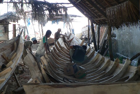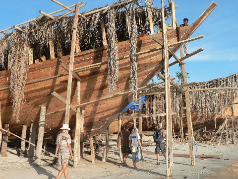 Links im Bild ist ein kleineres Boot zu sehen. Die Rümpfe werden ohne Nägel gebaut. Ihre Verbindungen zwischen den Planken und Spanten werden durch lange Holzdübel zusammen gehalten. Und jeder einzelne Dübel wird handgefertigt. Oben sieht man noch schön die abstehenden Dübel aus der Bordwand herausstehen. Sie werden zuerst in das Holz eingetrieben und später auf entsprechende Länge gekürzt.