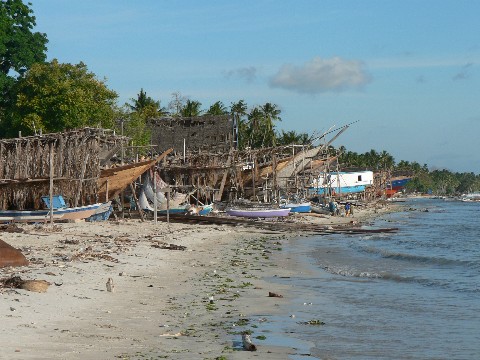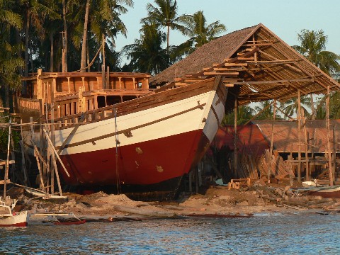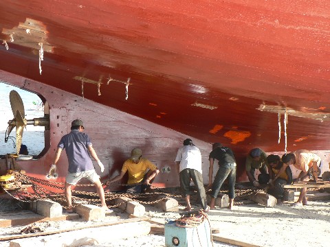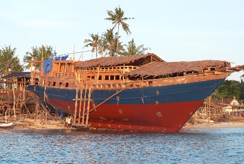 Indonesien hat eine lange Tradition im Bootsbau. Und das konnten wir in den letzten zwei Monaten, in denen wir nun durch Indonesien segeln auch feststellen. So arm die Menschen auch auf den Inseln oder in den Städten waren, ihre Boote hielten sie in Schuß. In Manokwari beobachteten wir, wie die Fischer ihre Boote trocken fallen ließen und das Unterwasserschiff bearbeiteten. Es wurden Ausbesserungen vorgenommen und das gesamte Boot neu gestrichen, obwohl wir aus der Ferne keine Makken erkennen konnten. Auch die kleineren Kanu-Auslegerboote machten einen sehr gepflegten Eindruck, ganz im Gegensatz zu den Booten in Papua Neuguinea, den Salomonen oder Vanuatu.