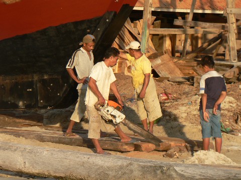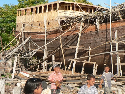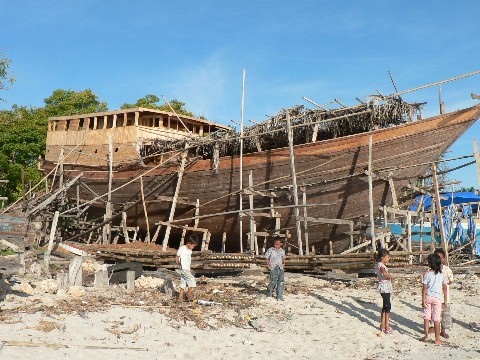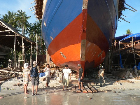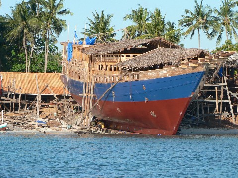 Dieses große Pinisi wurde gerade vorbereitet, um ins Wasser gelassen zu werden. Es soll später einmal in der Nähe von Bali zahlungskräftigen Urlaubern zur Verfügung stehen, um sie dann an die schönsten Tauchreviere Indonesiens zu fahren. Ein Italiener gab den Auftrag zu diesem Bau. Zwei weitere Schwesterschiffe stehen ebenfalls vor der Fertigstellung. Drei Baustellen weiter gab ein Deutscher ein großes Pinisi in Auftrag, welches ebenfalls für Tauchfahrten verchartert werden soll.