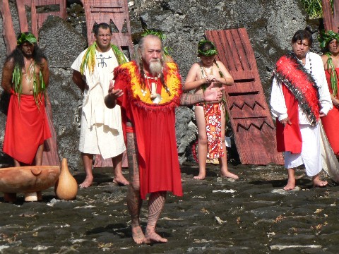 Nachdem alle Gäste eingetroffen waren, nahmen sie auf den historischen Steinen im Halbkreis platz und der oberste Priester von Tahiti eröffnete dieses Treffen mit einer sehr emotionalen Rede. Seine Familie ist vermutlich auch der Initiator für das Zustandekommen dieser Begegnung.