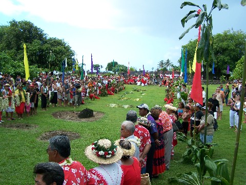 Die erste Delegation hat Aufstellung genommen. Sie kommt von den Osterinseln. In der Mitte ist der König zusehen mit seinem Gefolge. An seiner rechten Seite ist vermutlich seine Mutter. Leider war es für uns schwierig, die einzelnen Delegationen den jeweiligen Inseln oder Inselgruppen zuzuordnen. Von dem Plakat wußten wir, dass die Oberhäupter von Tahiti, Bora Bora, Huahine, Raiatea, Moorea, den Marquesas, den Cook Inseln, Samoa, Tonga und Fidji Inseln geladen warden, um nur einige zu nennen. Aber auch Neukaledonien und die Hawaii Inseln waren vertreten.