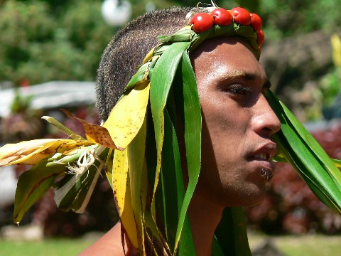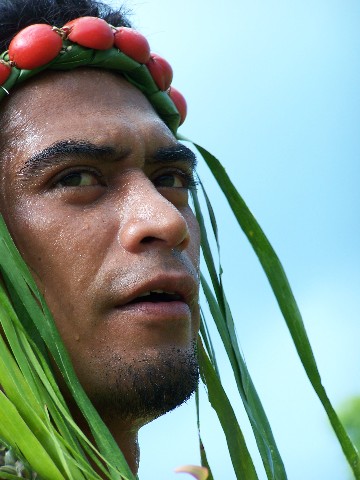 Zuerst versammelten sich am Vormittag alle königlichen Delegationen am Kultplatz und das in ihren festlichsten Gewändern. Und wieder dasselbe wie am ersten Tag, kaum ein einheimischer Zuschauer war gekommen und wir, Eva und Geza von der ungarischen Segelyacht Rotor und Martina und ich mitten drin. Inzwischen kannten wir vom Sehen schon beinahe alle Delegationsmitglieder. Und diese zeigten nicht die geringsten Berührungsängste. Und auch das Fotographieren war mehr als zwanglos, denn die Delegationen waren ebenso eifrig bemüht, sich und insbesondere die anderen Delegationsmitglieder zu filmen oder zu fotographieren. So hatte der König von Rapa Nui, er und seine Delegation hatten die aufregendste Bekleidung, die im Wesentlichen aus weißer und schwarzer Körperbemalung und Federn bestand, selbst gelegentlich die Sony Videokamera in der Hand, um die Tanzgruppe aus Huahine oder die Geangvorführung der Maoris aus Neuseeland zu filmen.